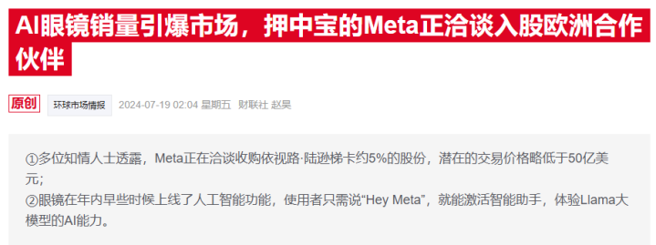 财联社一年前的报道提到,当时就有消息称,Meta正探索向依视路陆逊梯卡进行数十亿欧元的投资,可能收购后者约5%的股份。